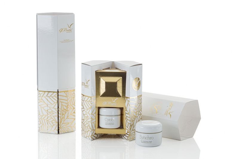 El paquete se presenta en dos partes: un cartón hexagonal que se abre para revelar el producto y una funda decorativa que lo encierra; juntos se combinan para dar al paquete una estructura sólida para el almacenamiento y la exhibición. El estampado de oro en toda la superficie ofrece una sensación de lujo y calidad premium, mientras que la experiencia de abrir el paquete marca la diferencia frente a sus competidores.